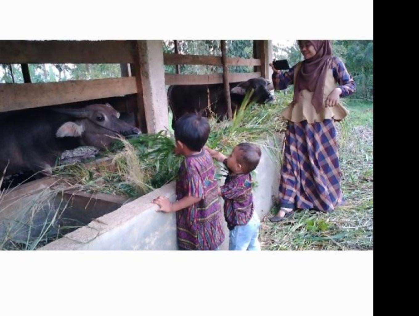 Kegiatan edukasi peternakan dengan meliahat dan memberi makan kerbau milik kelompok tani di kawasan wisata puncak rajo sago