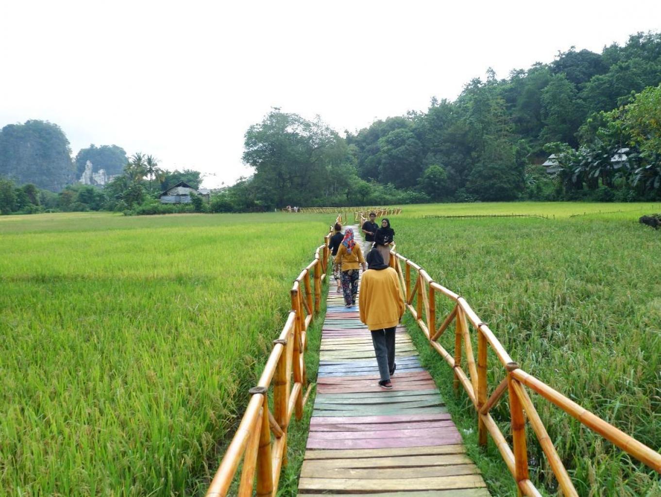 Jalan Setapak Diatas Saluran Air Diapit Hamparan Sawah Dan Gunung Karst