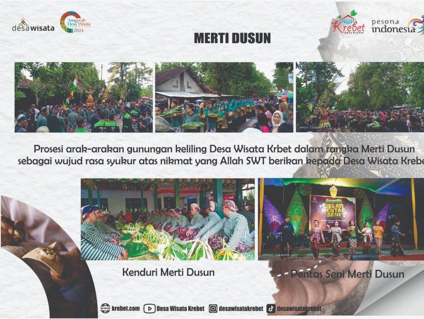 Acara yang bertujuan sebagai ungkapan rasa syukur kepada Tuhan Yang Maha Esa atas rezeki yang diberikan kepada Masyarakat Krebet dalam waktu setahun. Selain itu kegiatan Merti dusun juga ditujukan untuk mempererat tali persaudaran antar warga dan menggiatkan kegiatan gotong royong. Merti Dusun dilaksanakan setiap tahun dan berlangsung setiap bulan Jumadil Akhir. Seluruh warga masyarakat Krebet, baik orang tua, remaja, anak-anak ikut andil dalam kegiatan ini. Sebuah gunungan terdiri dari macam-macam sayuran dan buah-buahan serta dibuat secara bergiliran antar RT. Penyusunan bentuk dan isi gunungan disamakan dengan gunungan yang dilaksanakan oleh Kraton Ngayogyakarta Hadinigrat. Rangkaian acara Merti Dusun dimulai beberapa hari sebelum kegiatan puncak berlangsung. Berbagai kegiatan pentas kebudayaan, seperti tari, jathilan serta ketoprak dan pameran hasil warga sekitar di tampilkan dalam rangkain acara Merti Dusun.