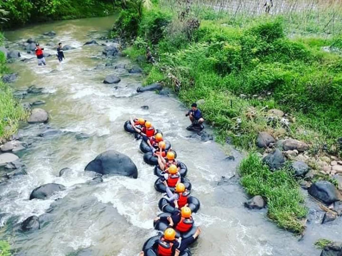 Layanan river tubing secara grup. Minimal ada 10 peserta. Durasi pengarungan sungai total satu jam.