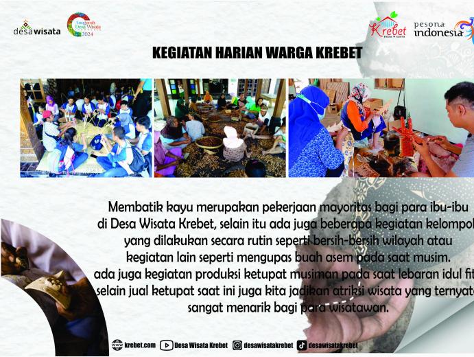 Kegiatan membatik merupakan kegiatan sehari-hari yang dilakukan oleh sebagian besar warga sekitar, sebagai pemenuhan kebutuhan hidup. Komoditas batik kayu produksi Desa Wisata Krebet sudah menjangkau skala nasional dan internasional. Pemasaran hasil kerajinannya pun beragam, ada yang dipasarkan melalui galeri pamer yang dimiliki oleh pengrajin, juga dipasarkan melalui kegiatan pameran baik di skala nasional maupun internasional. Lambat laun kegiatan membatik ini dijadikan sebagai aktivitas wisata dan saat ini menjadi andalan wisata Desa Wisata Krebet.