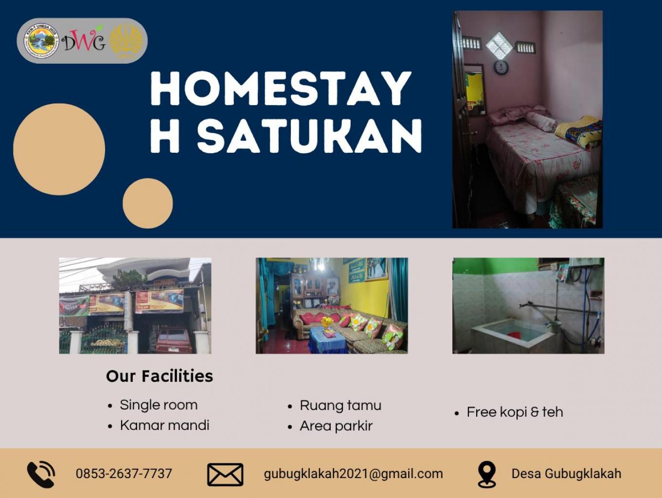 Kamar di Homestay H. Satukan didesain sederhana namun tetap memberikan kenyamanan maksimal bagi para tamu. Ruangan dilengkapi dengan tempat tidur bersih dan rapi, selimut hangat, serta pencahayaan alami dari jendela yang menghadap ke area pedesaan yang sejuk. Tersedia juga lemari kecil untuk menyimpan barang pribadi dan colokan listrik di dekat tempat tidur untuk menunjang kebutuhan wisatawan. Suasana kamar yang bersih dan tenang menjadikan homestay ini pilihan tepat bagi wisatawan yang ingin beristirahat sebelum melanjutkan perjalanan menuju Gunung Bromo, Ranu Kumbolo, atau Semeru