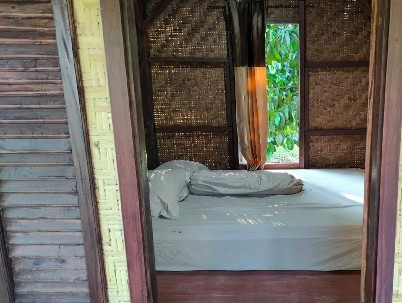 kamar yg d pasilitasi dengan tempat tidur, gantungan baju dan cermin. bentuk kamar ini sangat tradisional dan menyerupai bangunan khas sasak yg d sebut bale panggung.