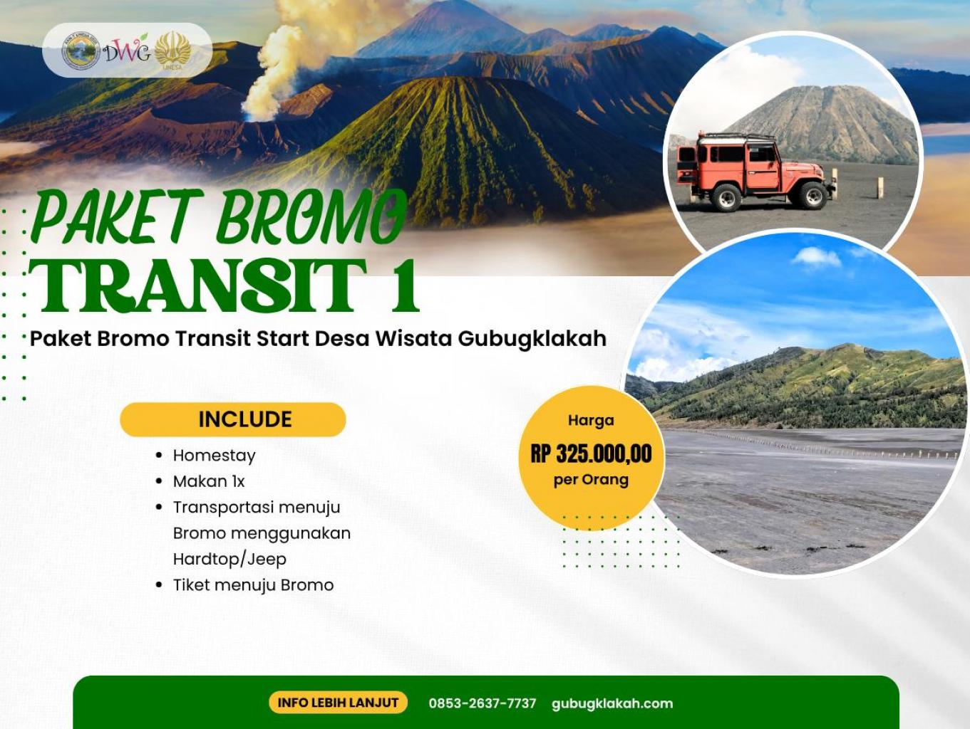 Paket Bromo Transit 1 Start Desa Wisata Gubugklakah menawarkan pengalaman wisata alam dan budaya yang lengkap. Wisatawan akan menginap di homestay warga untuk merasakan kehangatan dan keramahan masyarakat desa, menikmati hidangan lokal, serta melanjutkan perjalanan menuju Gunung Bromo menggunakan kendaraan Hardtop atau Jeep. Dalam paket ini juga sudah termasuk tiket masuk kawasan wisata Bromo. Dengan harga Rp 325.000 per orang, wisatawan dapat menikmati perpaduan antara pesona alam pegunungan dan kehidupan pedesaan yang autentik di kaki Gunung Bromo.