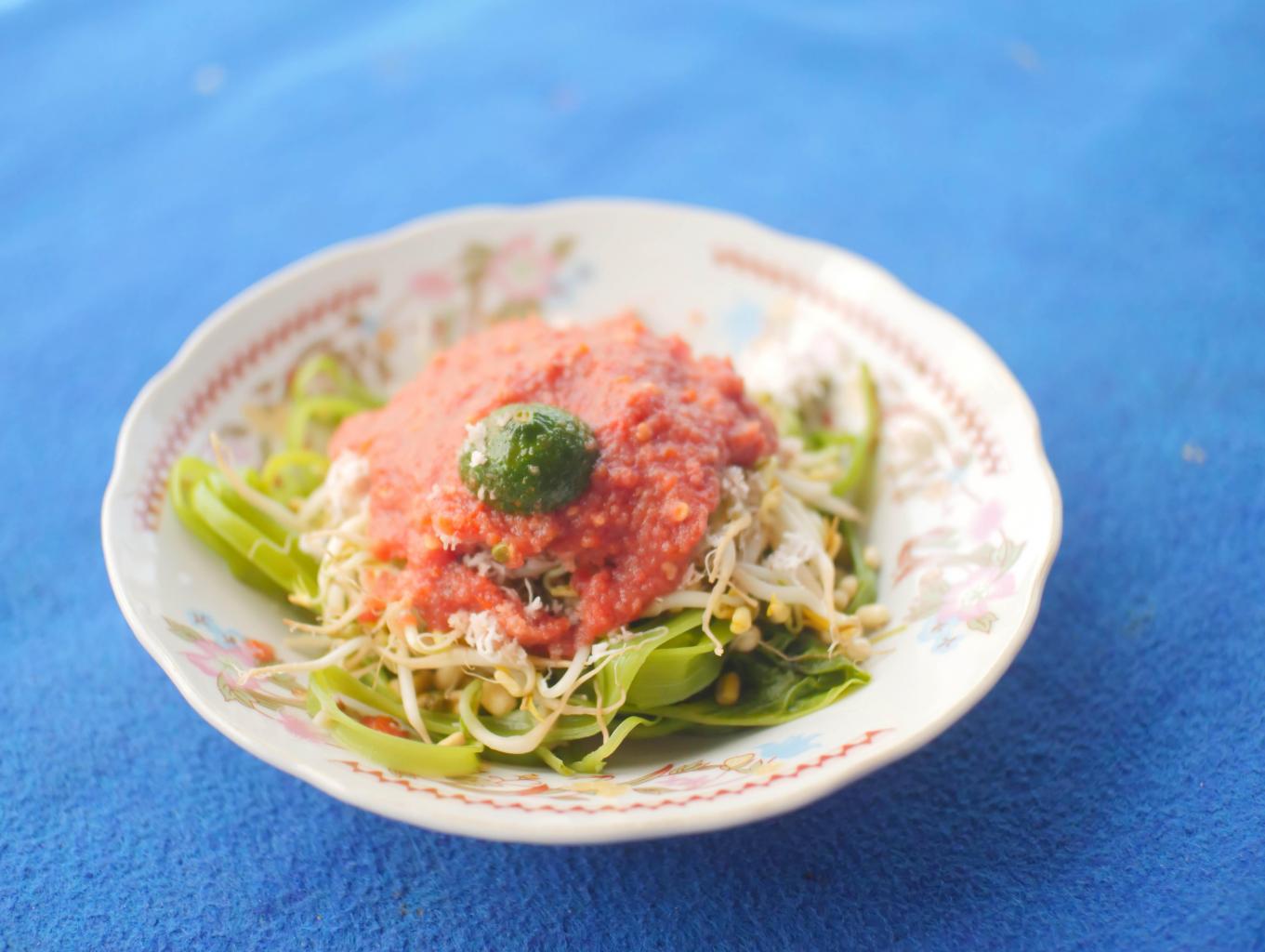 Proses penyajiannya adalah kangkung yang sudah direbus dan matang disajikan tidak dalam keadaan panas, tapi bersuhu normal ruang kemudian disiram sambal di atasnya. Sambal ini terdiri dari tomat, terasi, rawit, garam, dan jeruk nipis sehingga memberikan rasa asam