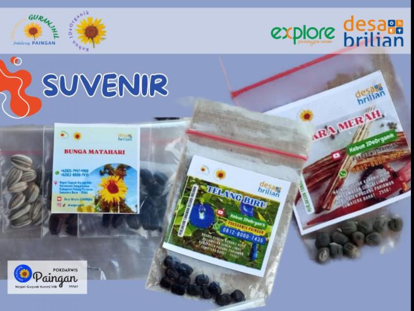 Biji/Benih tanaman berasal dari tanaman di Kebun IDeOrganik - Desa Wisata GURANJHIL Beberapa tanaman yang sudah dan sedang dijadikan suvenir maupun dijual diantaranya biji/benih: bunga matahari, okra merah, bunga telang biru/putih dan rosela.