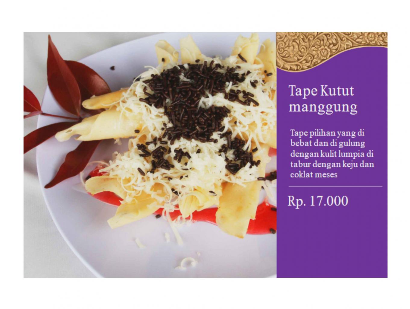 Tape pilihan yang dibebat dan digulung dengan kulit lumpia, ditabur dengan coklat dan meises